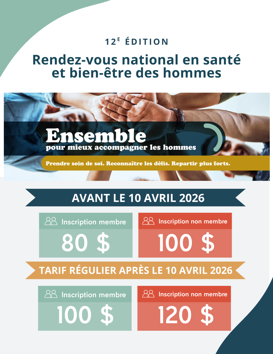 Sous le thème « Ensemble pour mieux accompagner les hommes. Prendre soin de soi. Reconnaître les défis. Repartir plus forts. », cette édition mettra au cœur de sa programmation le bien-être des intervenant·e·s et des gestionnaires œuvrant en santé et bien-être des hommes.